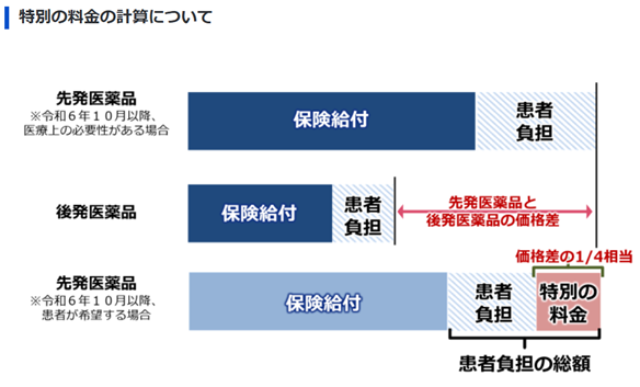 薬局では、令和6年10月から、後発医薬品のある先発医薬品(長期収載品)の選定療養制度が開始され、差額分の一部を自己負担いただくことになりました。